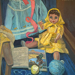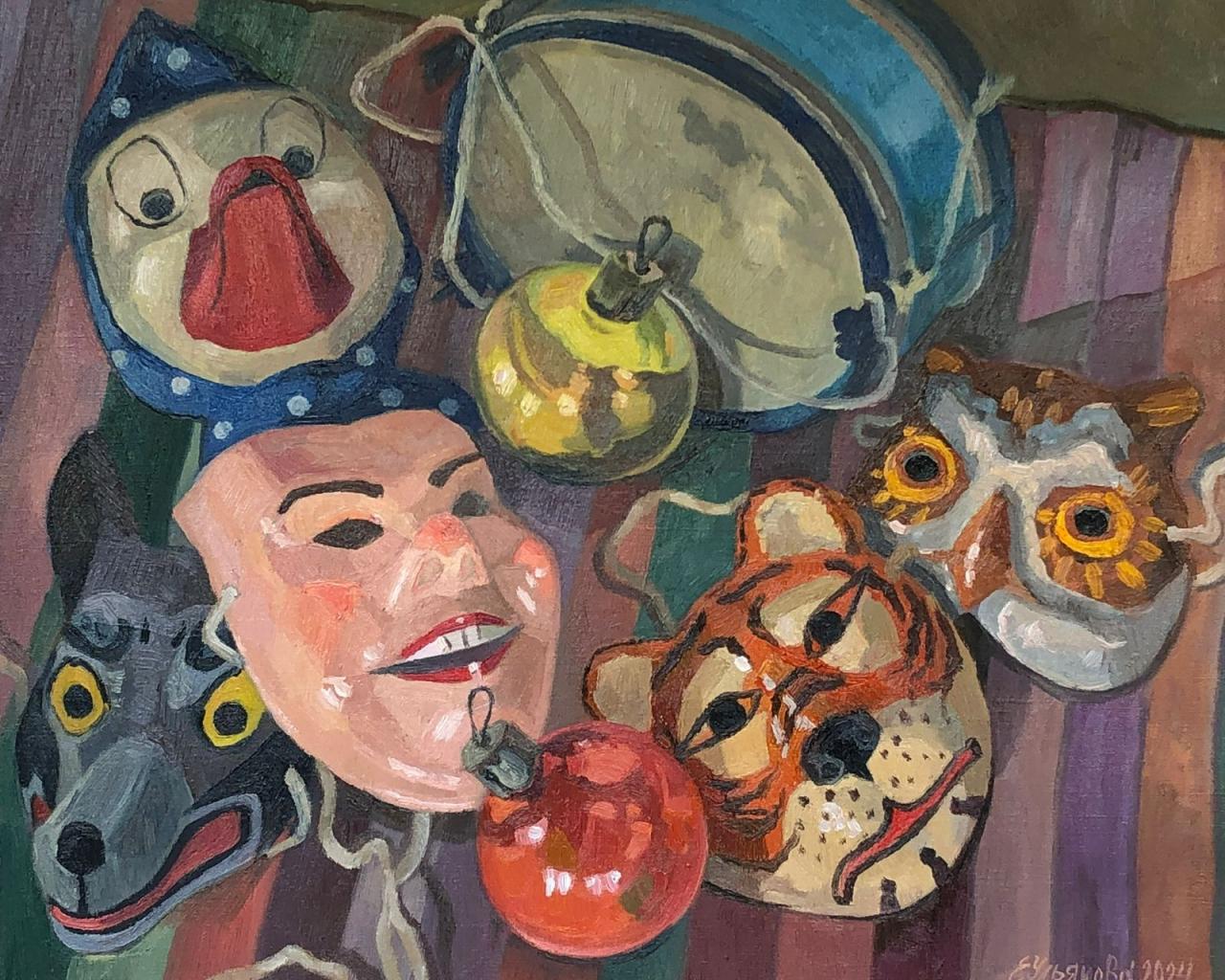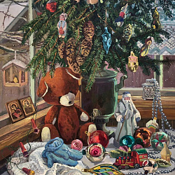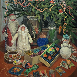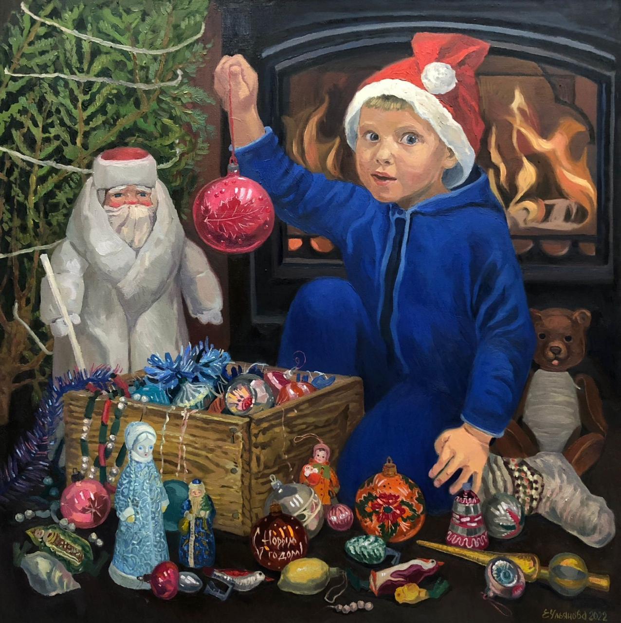 Экспозиция картин дополнена витринами с винтажными елочными игрушками из личной коллекции Екатерины Ульяновой.